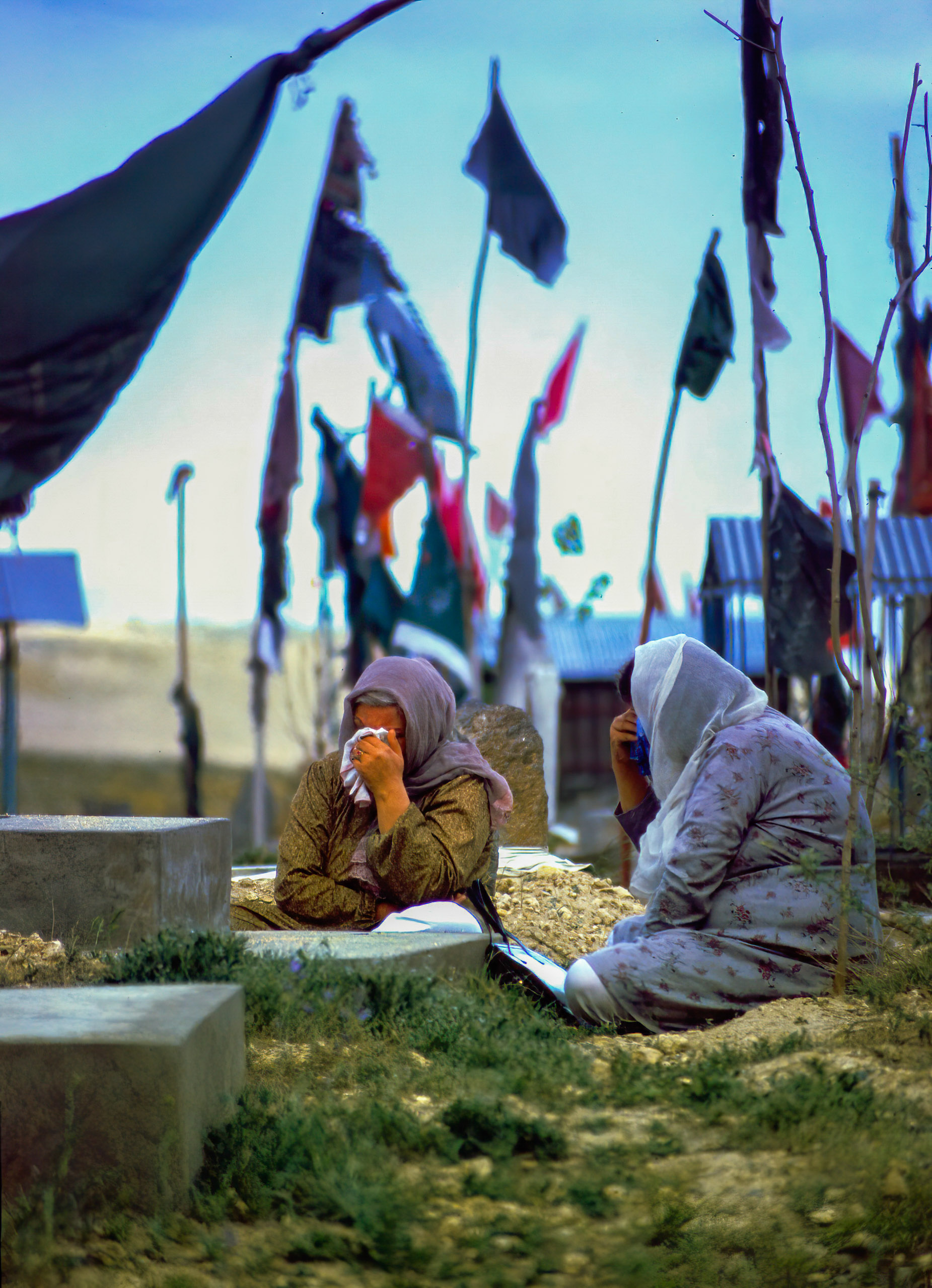 On two afternoons, we left Kabul in our old Ambassador car and drove through the countryside, suddenly finding ourselves in a completely different world. The grain harvest had not yet been brought in. In the fields, the farmers worked with the help of their children, just as they had done hundreds of years ago. Oxen were used as combine harvesters; if necessary, they even used their own feet to thresh the grain from the stalks. In the villages, school lessons for boys (girls were not sent to school) were held outdoors in the shade of the trees. Most villages had no paved roads. Donkey carts with large wooden wheels and old bicycles were, and presumably still are to this day, the main means of transport. And finally, a stop at one of the large cemeteries on the outskirts of town, where thousands of small flags represented the seemingly countless Afghan victims of the cruel war; and those two elderly women, mothers, mourning a loved one.